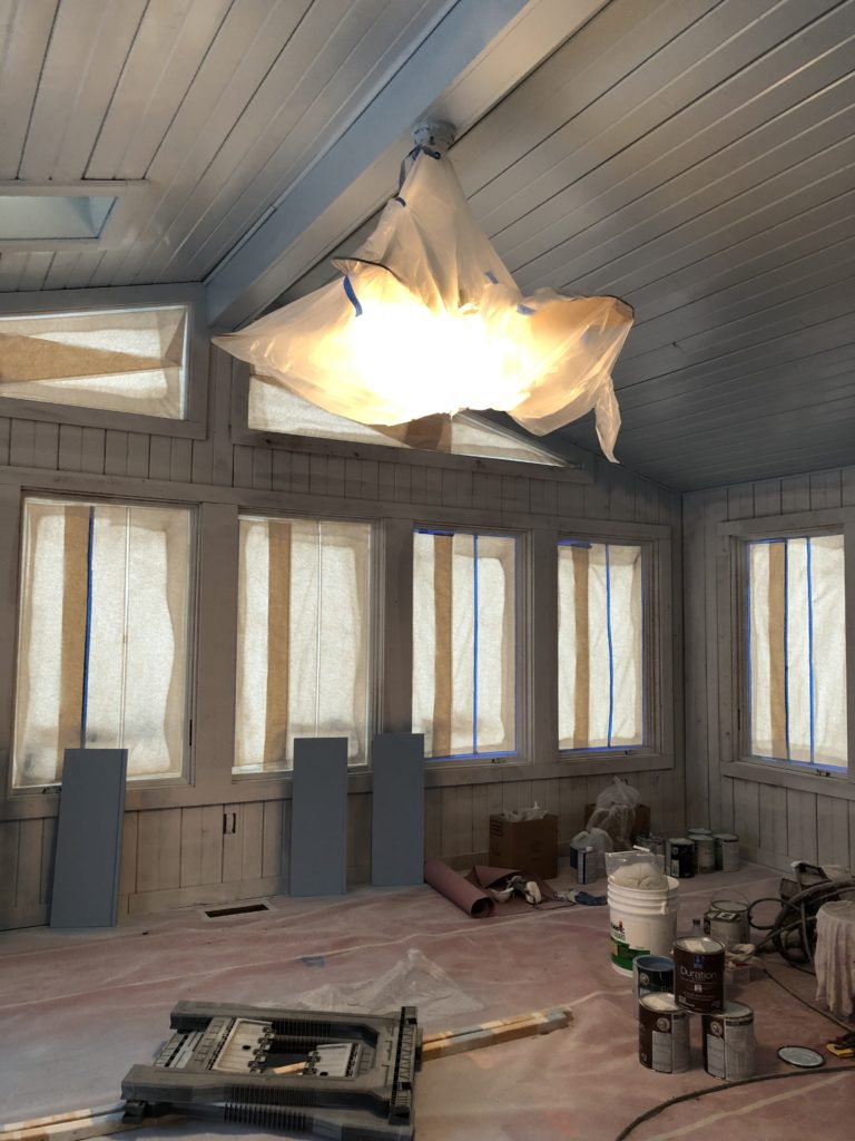Here’s a look at the room, mid-transformation. It took a LOT of coats of thinly sprayed paint to cover the knotted boards. It also takes a lot of tape and plastic to properly cover the windows and floors so the paint only goes where you want it to!