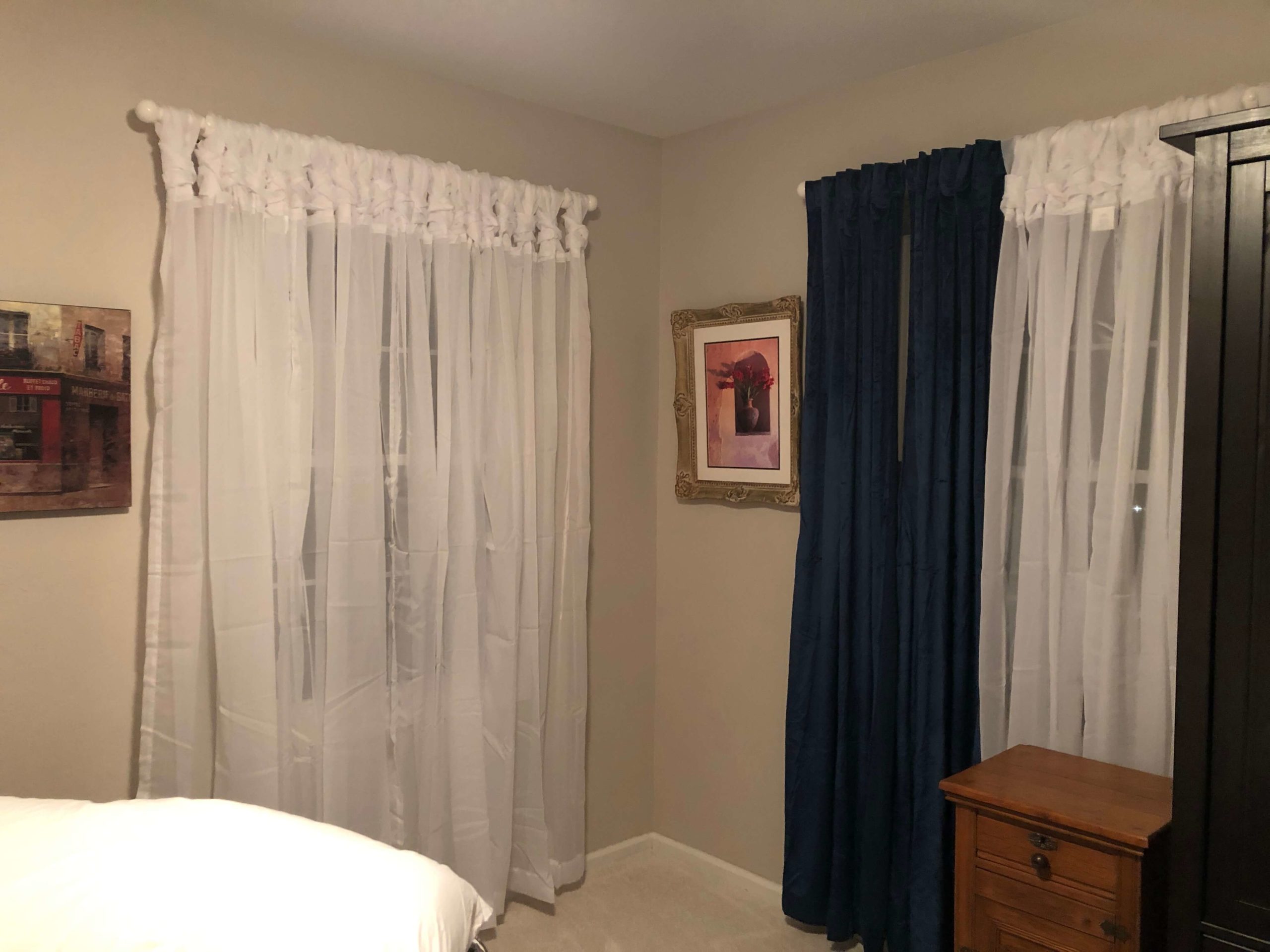 That’s Nathan installing a “new” ceiling fan that used to be in my son’s room. You can ignore him and his purple shirt. Look behind him at the DRAPERIES! I think they’re fabulous. My cat also approves. Sort of. She’s still resentful that there aren’t tassels. Look at that disapproving stare (if you can see her on that gray chair).